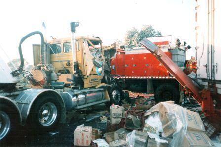 As the member opened the door and started to climb down, next minute, a large muffled bang occurred. Bargo 1 had been hit from the rear by a paper truck that was travelling along at 110 km/h. Bargo 1 was hit so hard that it had spun around and left the crew member lying in the middle of the road. As Bargo 1 sat on the side of the road, with the left side facing all south bound traffic. The driver was stuck inside the truck with the door jammed. While the rest of the crew were assisting the member injured climbing out that was lying on the road. As the driver was stuck inside, the truck was hit by a blue circle cement tanker that was travelling at a speed of 83 km/h. Bargo 1 almost rolled but was stopped by the side guard rail. A crew member jumped up and dragged the trapped driver out of the right hand window. As they jumped out of the truck, another bang was heard as a McDonalds truck struck the accident. Then another truck and then another.